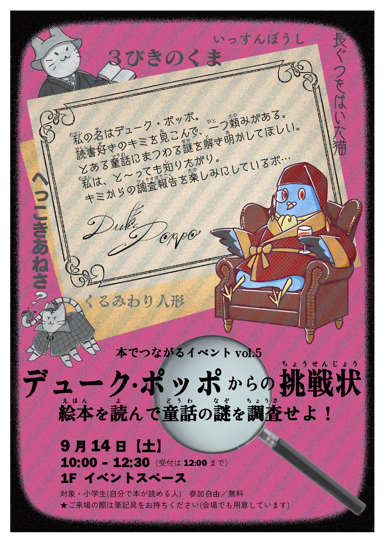 本でつながるイベントvol.5「デューク・ポッポからの挑戦状 絵本を読んで童話の謎を調査せよ!」を開催します!