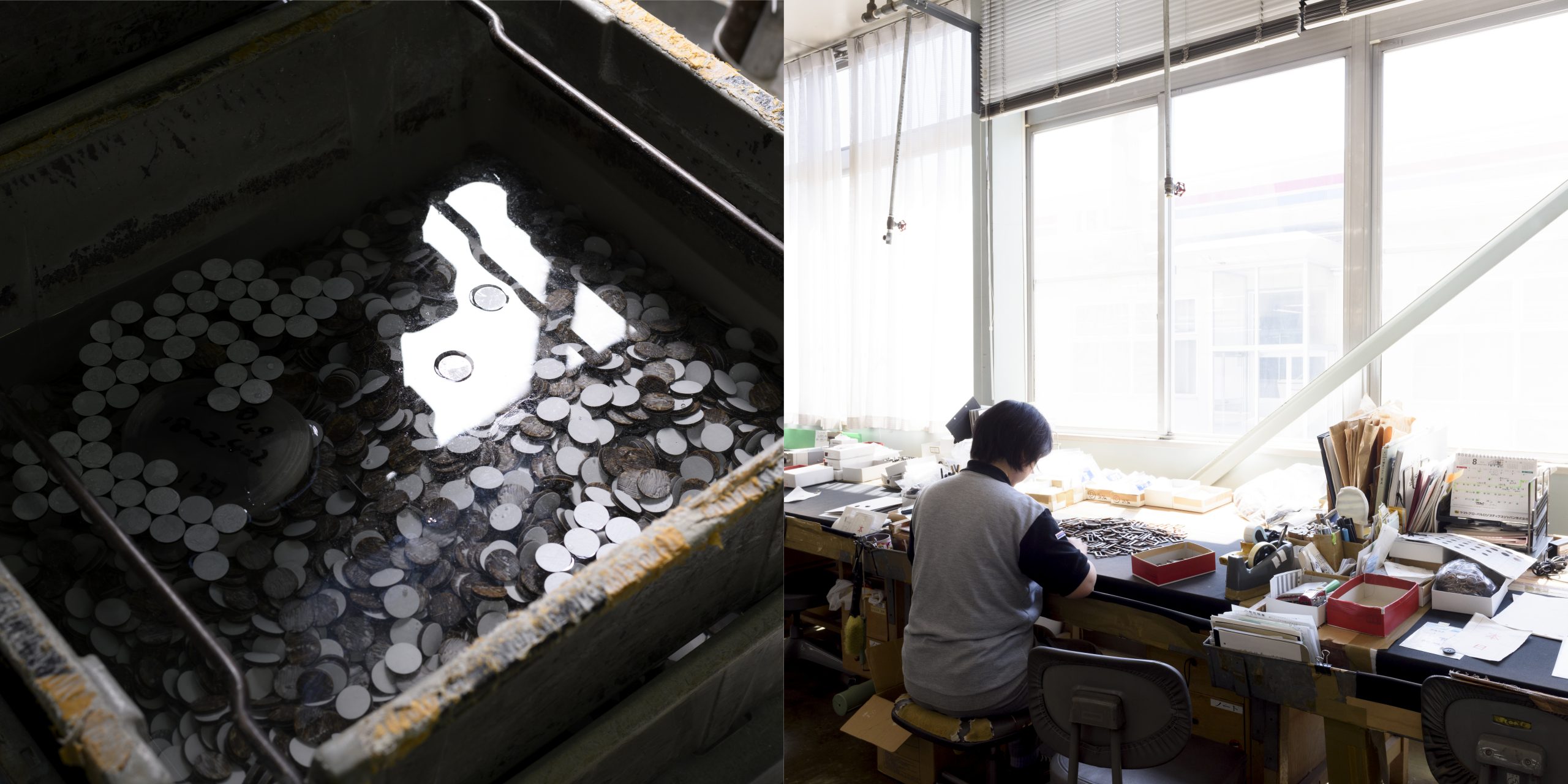 メタルボタンには一枚物とかぶせボタンがある。一枚物はメダルや硬貨みたいにソリッドなボタン、かぶせボタンは和菓子のモナカみたいに表と裏をかしめて作る。学生服やブレザーのボタンには所属を表す校章やマークがひとつひとつ刻印される。金属のボタンは強くて、ユニフォームとの相性がいい。