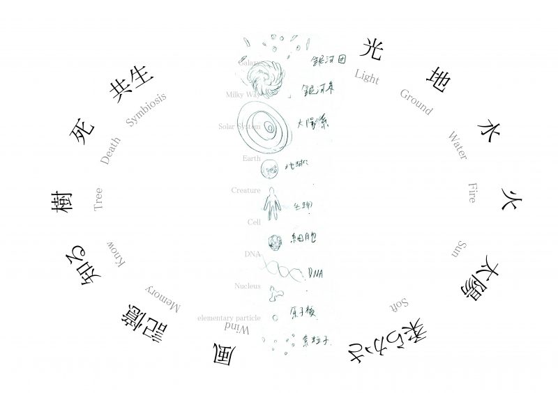 また、展示室3では、《46億年の記憶》に基づき、展示室に散りばめられた「光」「地」「水」「火」「太陽」などの大小島の作品世界に関係する言葉をキーワードに、来場者が「続きの物語」を想像=創造するワークショップルームを作りあげます(※3)。
