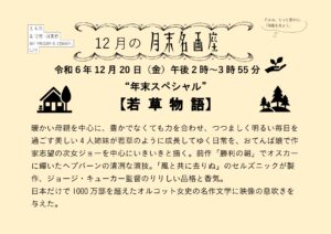 12月度月末名画座を開催します! 2024年12月20日(金) 世界中で愛され続ける不朽の名作!4姉妹の物語 インフォメーション テ ー マ:「年末スペシャル」 開催日時:12月20日(金)14:00~15:55 会 場:美術館・図書館3階 視聴覚ホール 対 象:どなたでも 定 員:先着70名 入 場 料:無料(入退場自由) 申 込:当日、直接3階視聴覚ホールまでお越しください。開場時間は30分前です。 プログラム 「若草物語」 1933年/115分 ※字幕あり
