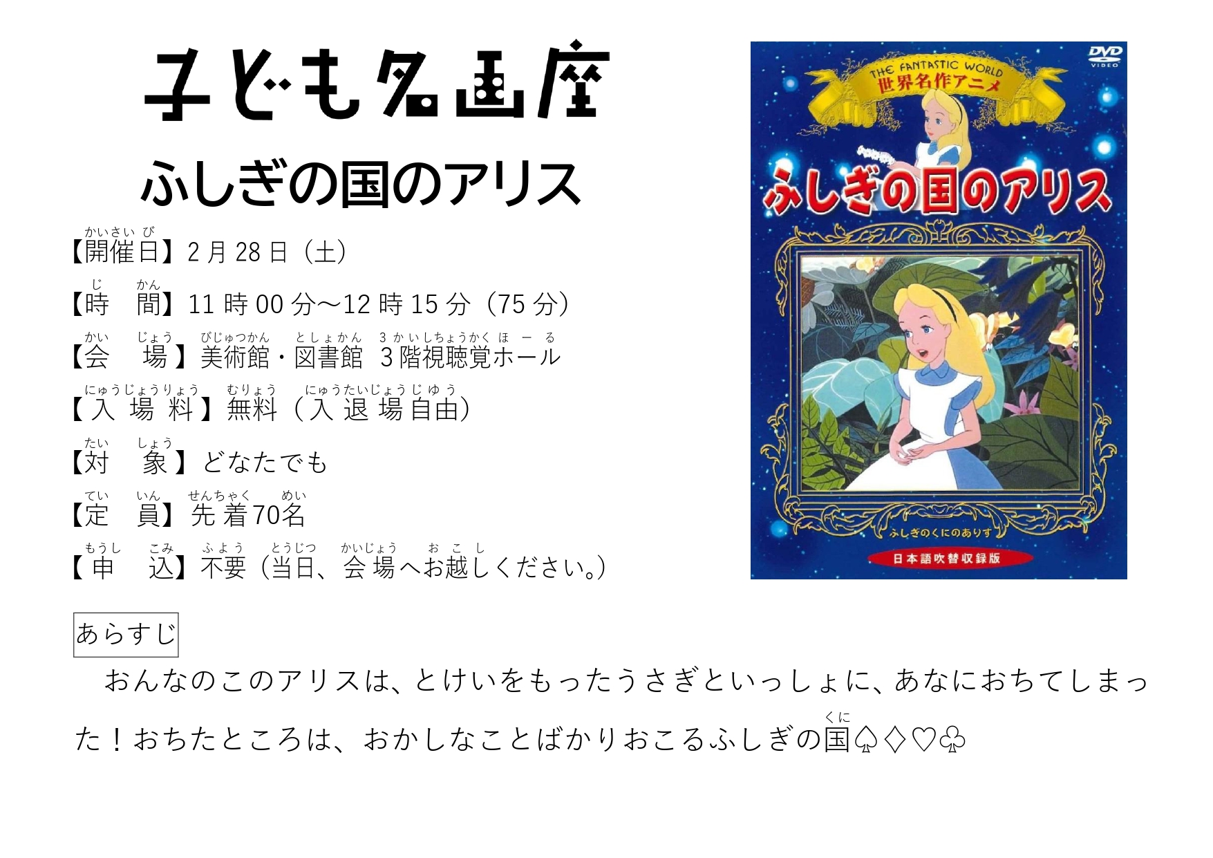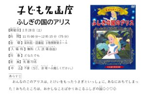 2月度子ども名画座を開催します! 2026年2月28日(土) ふしぎの国で起こるヘンテコな出来事の数々。 こどももおとなも、ぜひご覧ください! インフォメーション 開催日時:2月28日(土)11:00~12:15 会 場:美術館・図書館3階 視聴覚ホール 対 象:どなたでも(大人の方もご覧いただけます) 定 員:先着70名 入場料:無料(入退場自由) 申 込:当日、直接3階視聴覚ホールまでお越しください。開場時間は30分前です。 プログラム 「ふしぎの国のアリス」 75分