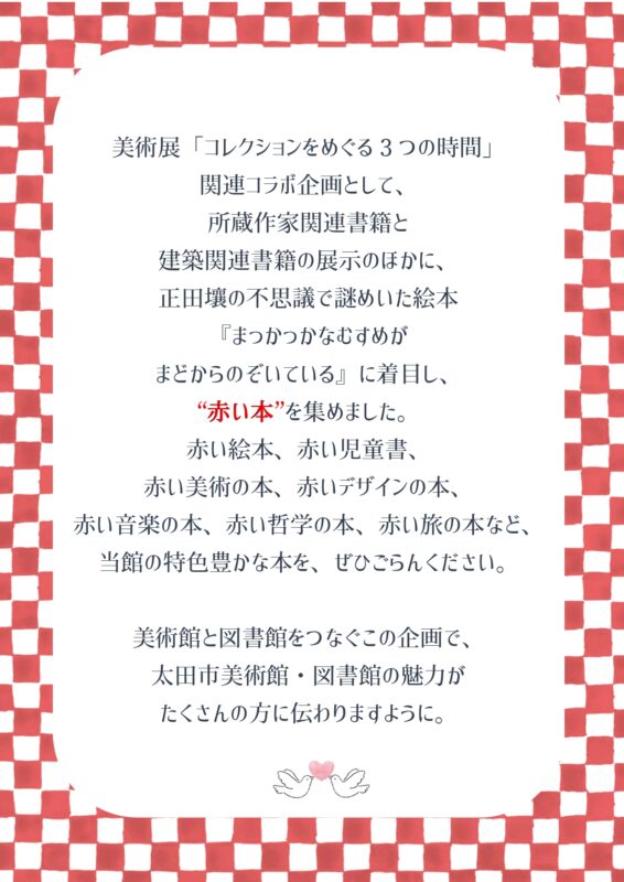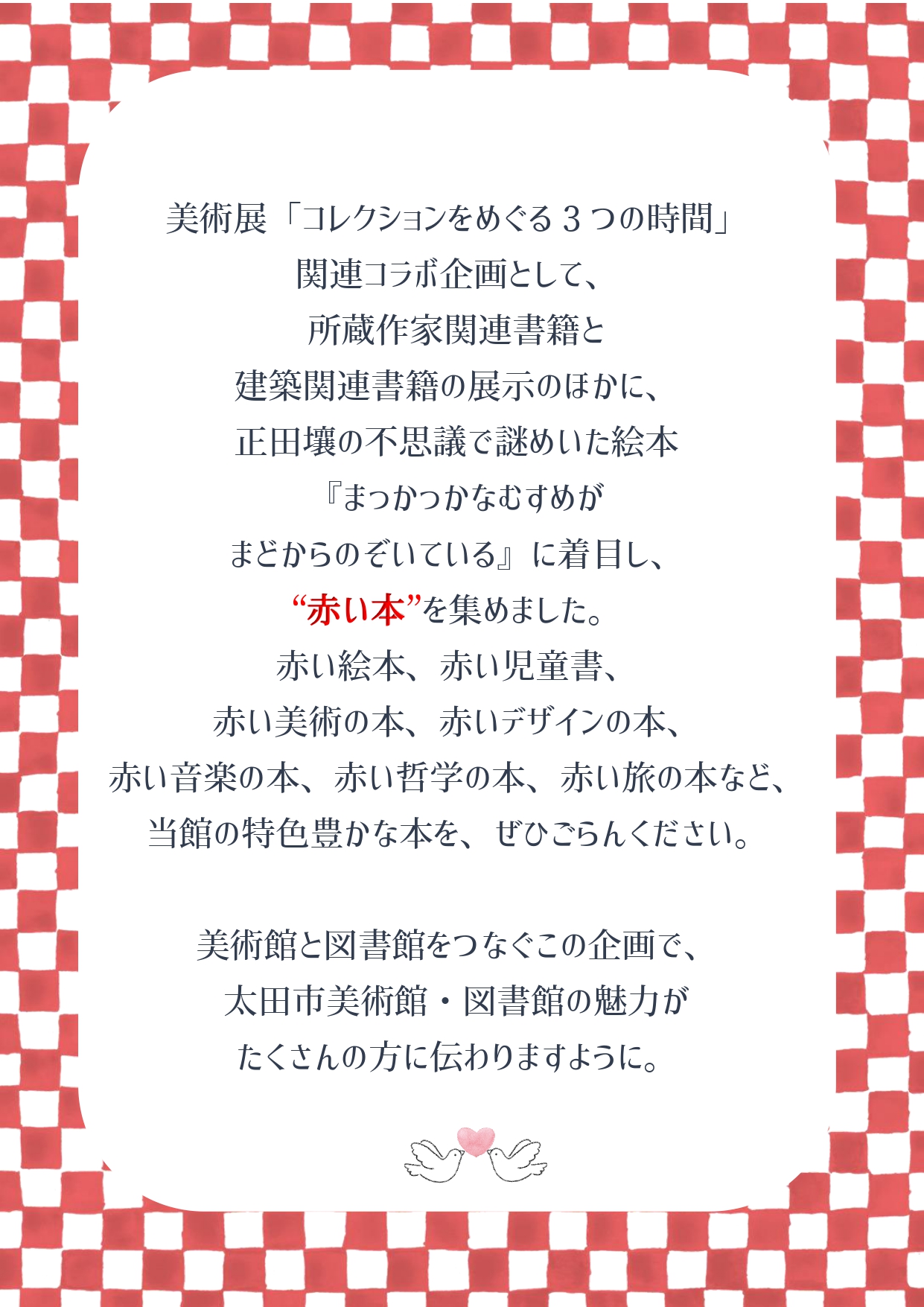 美術展「コレクションをめぐる3つの時間」関連コラボ企画として、当館所蔵作家関連書籍と当館建築関連書籍のほかに、美術館&図書館コラボワークショップで使用される『まっかっかなむすめがまどからのぞいている』にあわせて“赤い本”を集めました。